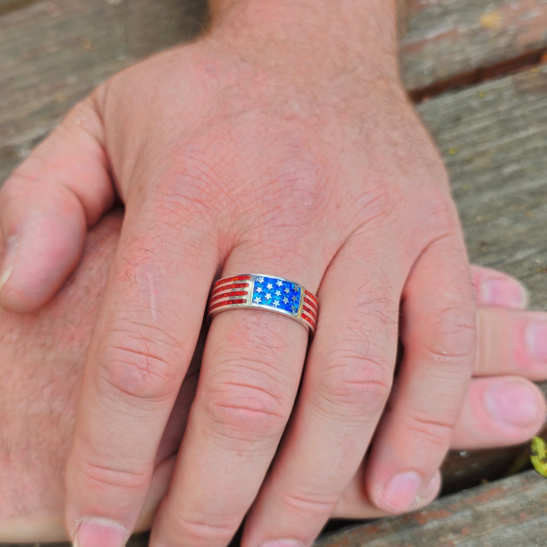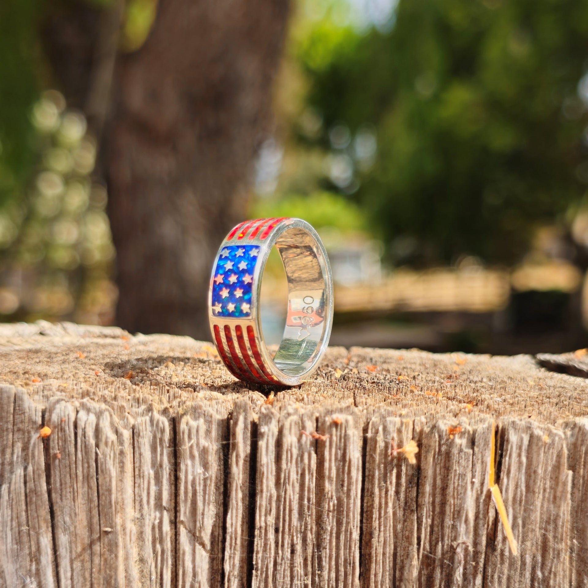 Our exclusive new Stars and Stripes Ring has been created exclusively for T2T. The ring has four channels of crushed red opal inlay creating the stripes. The field of stars background is inlaid with crushed blue opal, giving this ring a stunning look. This ring is made with .960 Argentium Silver, which contains a higher percentage of pure silver than traditional sterling. Agrentium Silver outshines gold, platinum, and sterling silver, and is tarnish-resistant, more durable, and stronger than other metals.